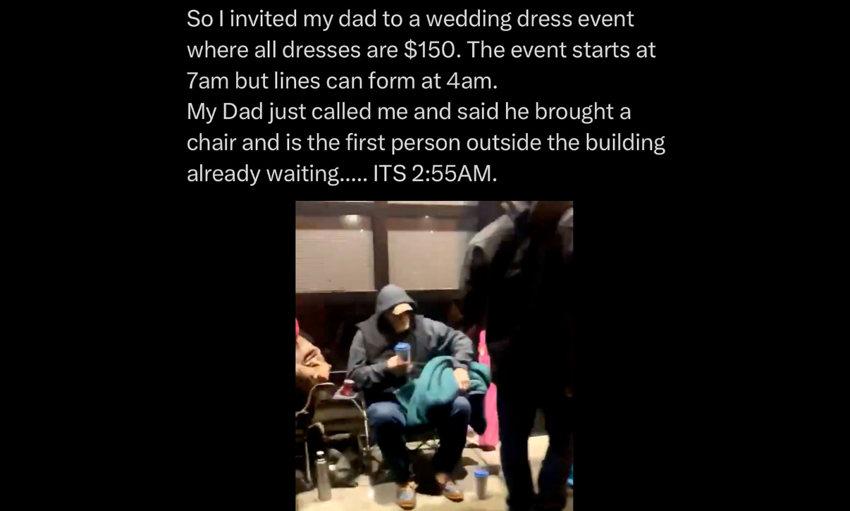When she mentioned a wedding dress sale β doors opening at 7, lines forming at 4 β he didnβt hesitate. He showed up early, braving the cold, determined to be first in line so his daughter could find her dream gown. πβ¨