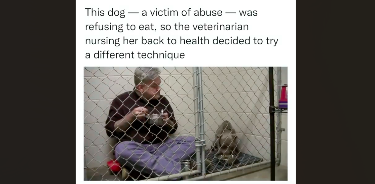 💛 Instead of forcing him, the vet simply stepped inside the kennel, sat down beside the frightened pup, and placed a bowl in front of them both. Then, without a word, he began to eat from a dog dish — slow, calm, and kind. The dog stared, confused at first… then curious. 🐾 Minute by minute, the trembling softened. Finally, with a hesitant sniff and a quiet breath of trust, the little dog began to eat too. 🌈