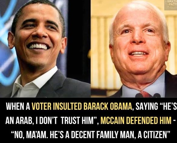 In that moment, instead of allowing the inflammatory comment to stand or feeding into the growing hostility, McCain took the microphone. He paused for a moment and responded with remarkable poise and conviction: “No, maโam. Heโs a decent family man, a citizen that I just happen to have disagreements with on fundamental issues.” His words echoed across the crowd, and for a brief moment, the atmosphere shifted.