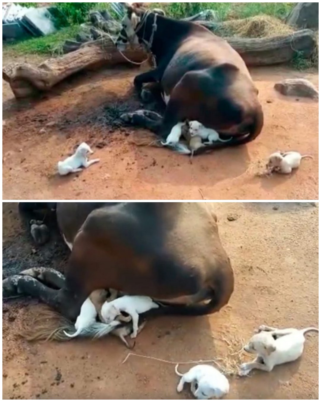 A gentle cow, sensing the puppies’ vulnerability, stepped forward in a way no one expected. With a quiet grace, she allowed the tiny pups to approach her. Without hesitation, she opened herself up to them, offering her warmth, her body as shelter, and even her milk. The puppies, desperate for comfort, instinctively nuzzled against her, finding solace in her presence. What was once a moment of heartbreaking loss began to transform into a powerful display of kindness.