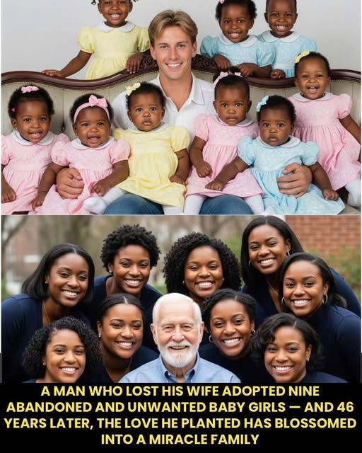 For months, Richard wandered through grief like a ghost. Until one cold, rainy night, he walked past St. Catherine’s Orphanage and saw something that would change everything — nine baby girls, abandoned and unwanted. The sisters at the orphanage spoke softly of sending them to separate homes. But Richard, his voice trembling yet firm, said, “No. They stay together. I’ll take them all.” 🙏