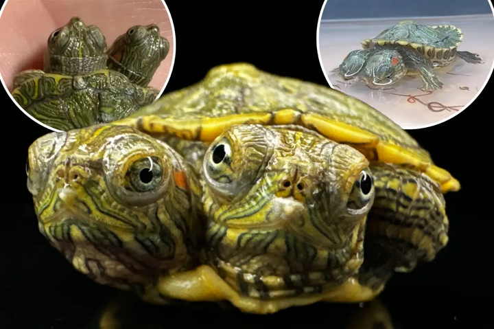 Under the gentle warmth of a glowing lamp, a tiny turtle emerged from its shell — but this hatchling was unlike any other. With two delicate heads resting on a single body, it blinked curiously at the new world around it. Each head had its own mind, its own rhythm, yet together they shared one heart and one fragile shell. This baby turtle was not a mistake of nature, but rather a rare and beautiful reminder that life often writes its own extraordinary stories. 🌱💖