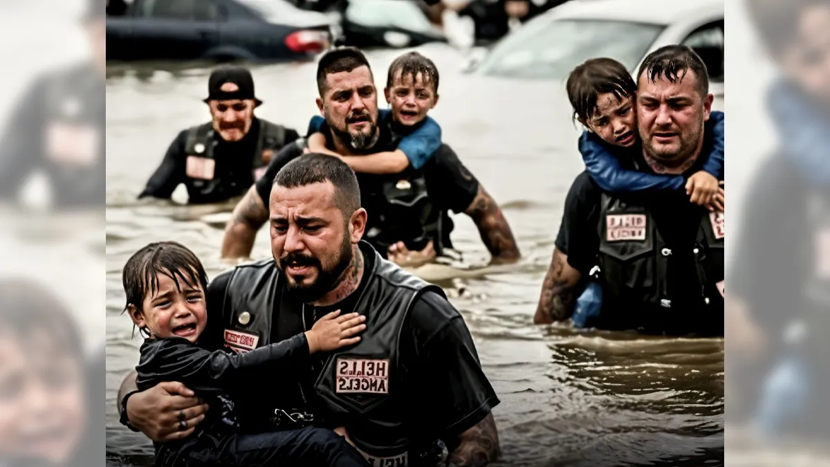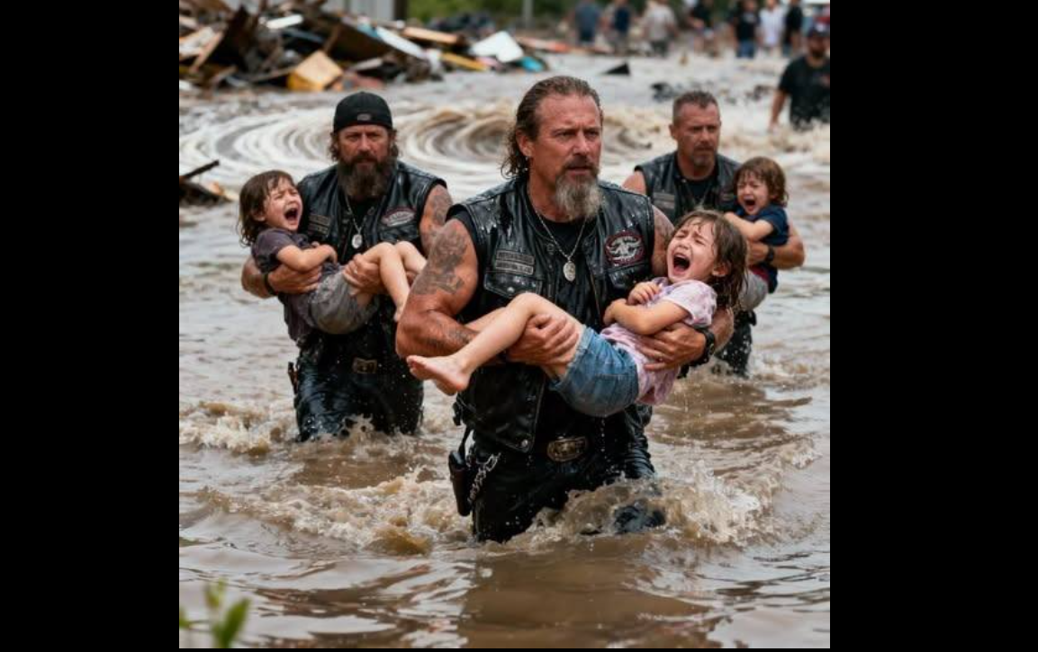 Then came the sound that cut through the chaos β the rumble of motorcycles. ποΈπ₯ A group of bikers, drenched and fearless, roared into action. Without hesitation, one of them β his jacket soaked and heart steady β smashed the back door open with his bare hands. π₯ Others formed a human chain, gripping each other tight as they lifted the children, one by one, to safety. β€οΈπΆ