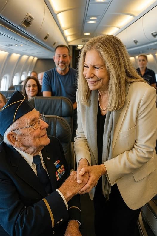 Without hesitation, Barbra rose from her comfortable first-class seat and walked down the aisle, the soft hum of the plane blending with the gentle rhythm of her steps. Passengers watched in stunned silence as she leaned toward the veteran and spoke with sincere warmth: “You’ve done more for this country than I ever could.” Her words carried more power than any performance, more grace than any standing ovation. And then, with a simple smile, she offered him her seat — a gesture of pure humanity that no camera or award could ever capture.